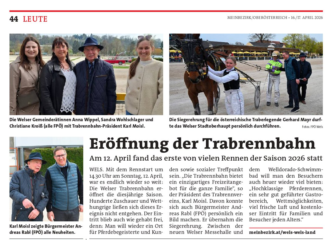 Mit dem Rennstart um 14.30 Uhr am Sonntag, 12. April, war es endlich wieder so weit: Die Welser Trabrennbahn eröffnet die diesjährige Saison. Hunderte Zuschauer und Wetthungrige ließen sich dieses Ereignis nicht entgehen. Der Eintritt blieb auch wie gehabt frei, denn: Man will wieder ein Ort für Pferdebegeisterte und Kunden sowie sozialer Treffpunkt sein. "Die Trabrennbahn bietet ein einzigartiges Freizeitangebot für die ganze Familie", so der Präsident des Trabrennvereins, Karl Moisl. Davon konnte sich auch Bürgermeister Andreas Rabl (FPÖ) persönlich ein Bild machen. Er übernahm die Siegerehrung. Zwischen der neuen Welser Messehalle und dem Welldorado-Schwimmbad will man den Besuchern auch heuer wieder viel bieten: "Hochklassige Pferderennen, ein sehr gut geführter Gastrobereich, Wettmöglichkeiten, viel frische Luft und kostenloser Eintritt für Familien und Besucher jeden Alters."