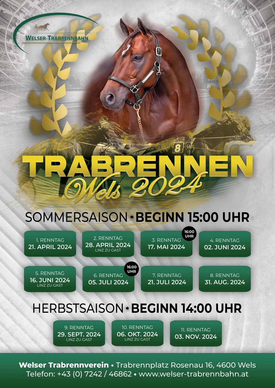 Erhöhte Gewinnchancen beim Wetten, viele Gewinnspiele sowie ein familienfreundliches Kinderprogramm erwartet die Gäste der Welser Trabrennbahn.