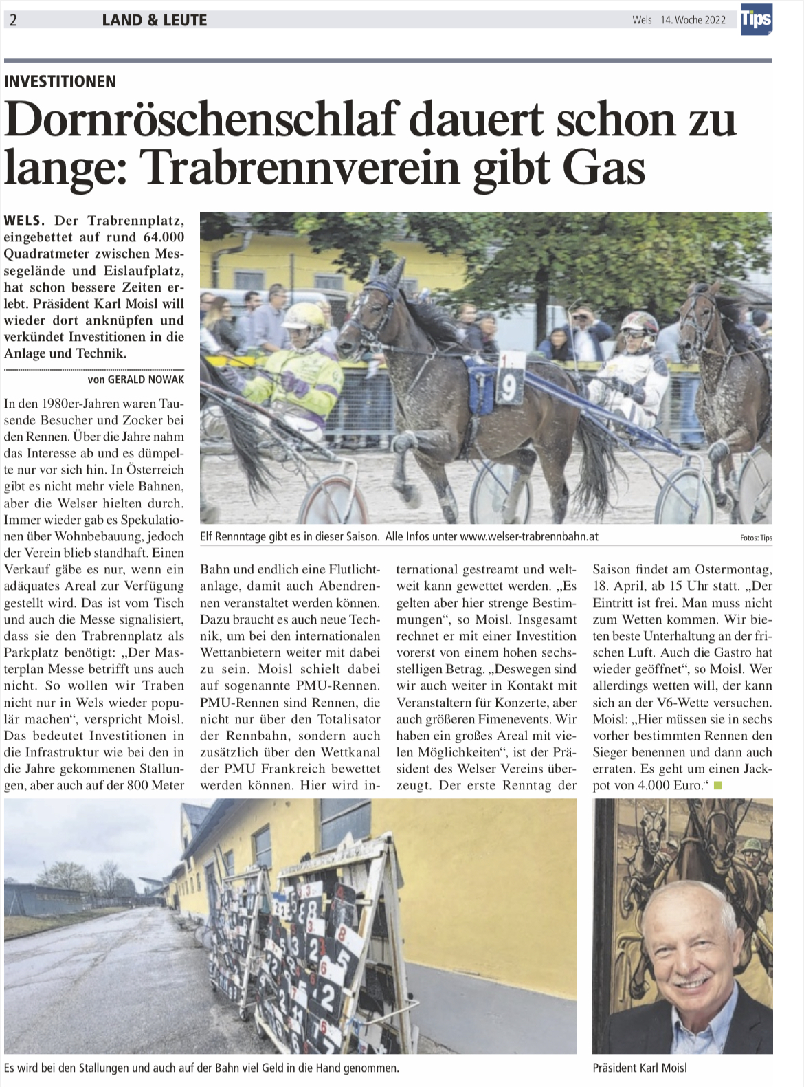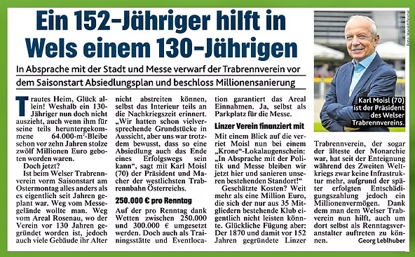 WELS. Der Trabrennplatz, eingebettet auf rund 64.000 Quadratmeter zwischen Messegelände und Welldorado/Eislaufplatz, hat schon bessere Zeiten erlebt. Präsident Karl Moisl will wieder dort anknüpfen und verkündet Investitionen in die Anlage und Technik.