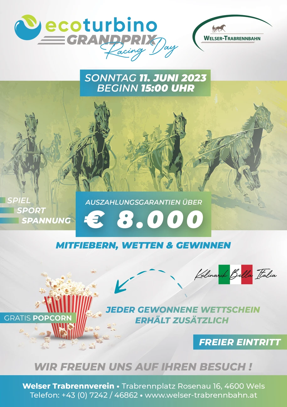 Am Sonntag, 11. Juni 2023 um 15:00 Uhr - findet der fünfte Renntag auf der Welser Trabrennbahn statt. Erhöhte Gewinnchancen beim Wetten, viele Gewinnspiele sowie ein familienfreundliches Kinderprogramm erwartet die Gäste der Welser Trabrennbahn.