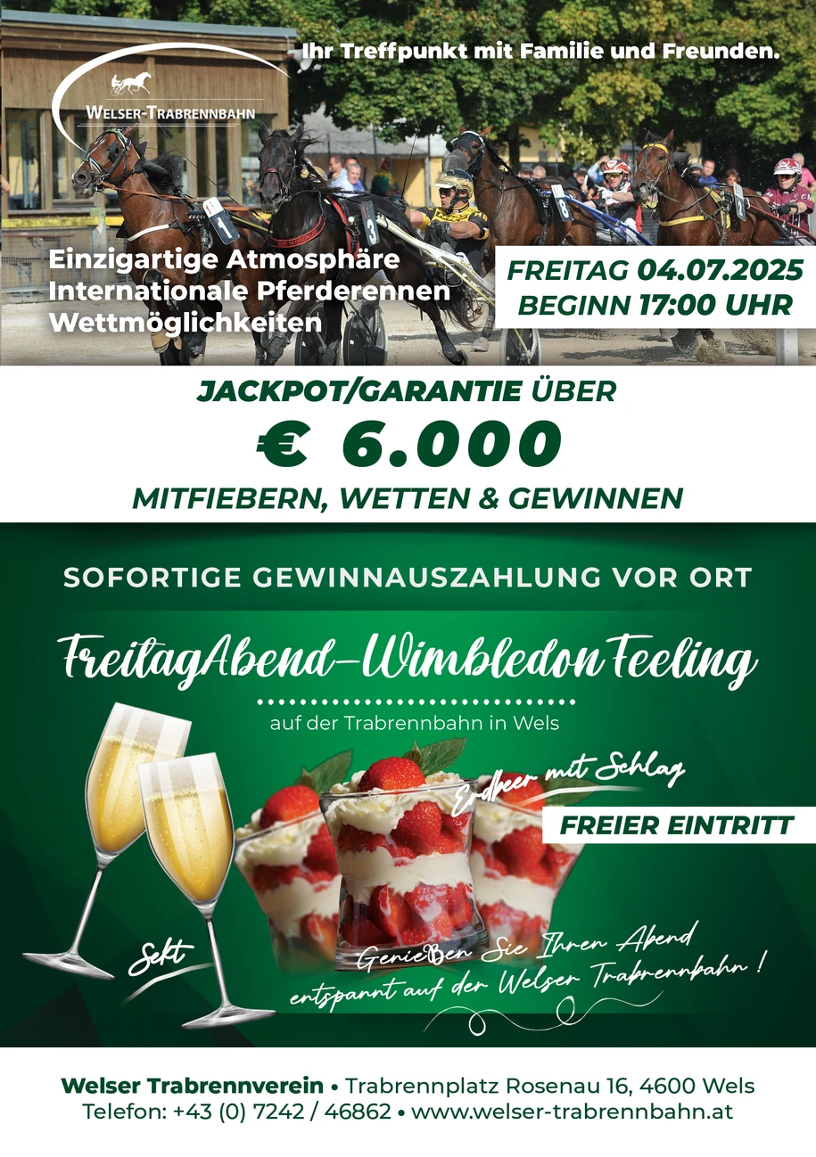 Am Freitag, 04. Juli 2025 um 17:00 Uhr - findet der fünfte Renntag bei freiem Eintritt - auf der Welser Trabrennbahn (Rosenau 16, 4600 Wels) statt.