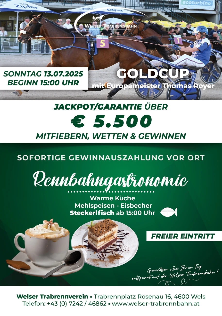 Am Sonntag, 13. Juli 2025 um 15:00 Uhr - findet der sechste Renntag bei freiem Eintritt - auf der Welser Trabrennbahn (Rosenau 16, 4600 Wels) statt.